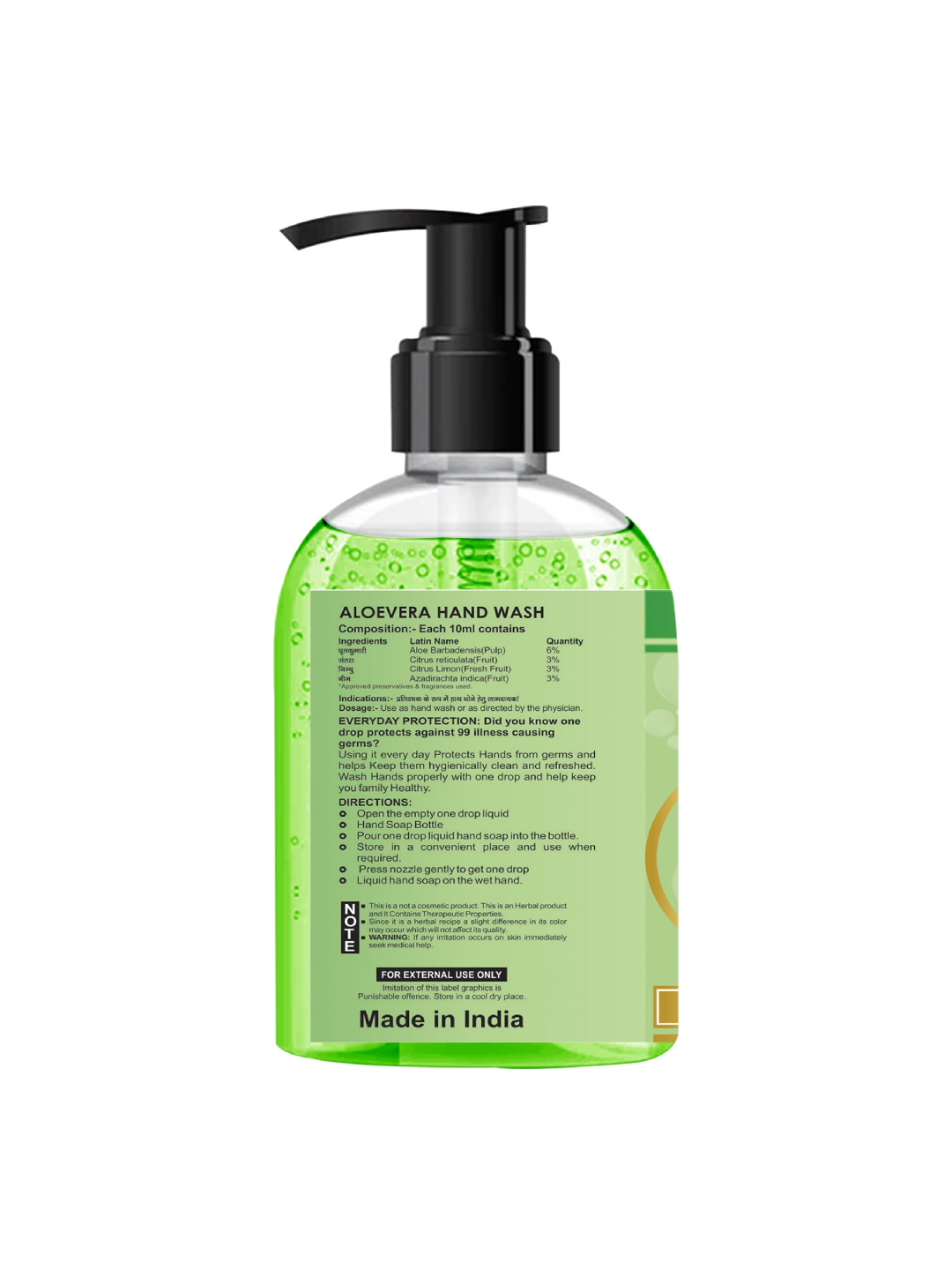 Directions: Wet your hands and dispense Aloe vera hand wash by gently pressing the nozzle. Massage the product into a lather by gently rubbing your hands together in circular motions, then rinse thoroughly.