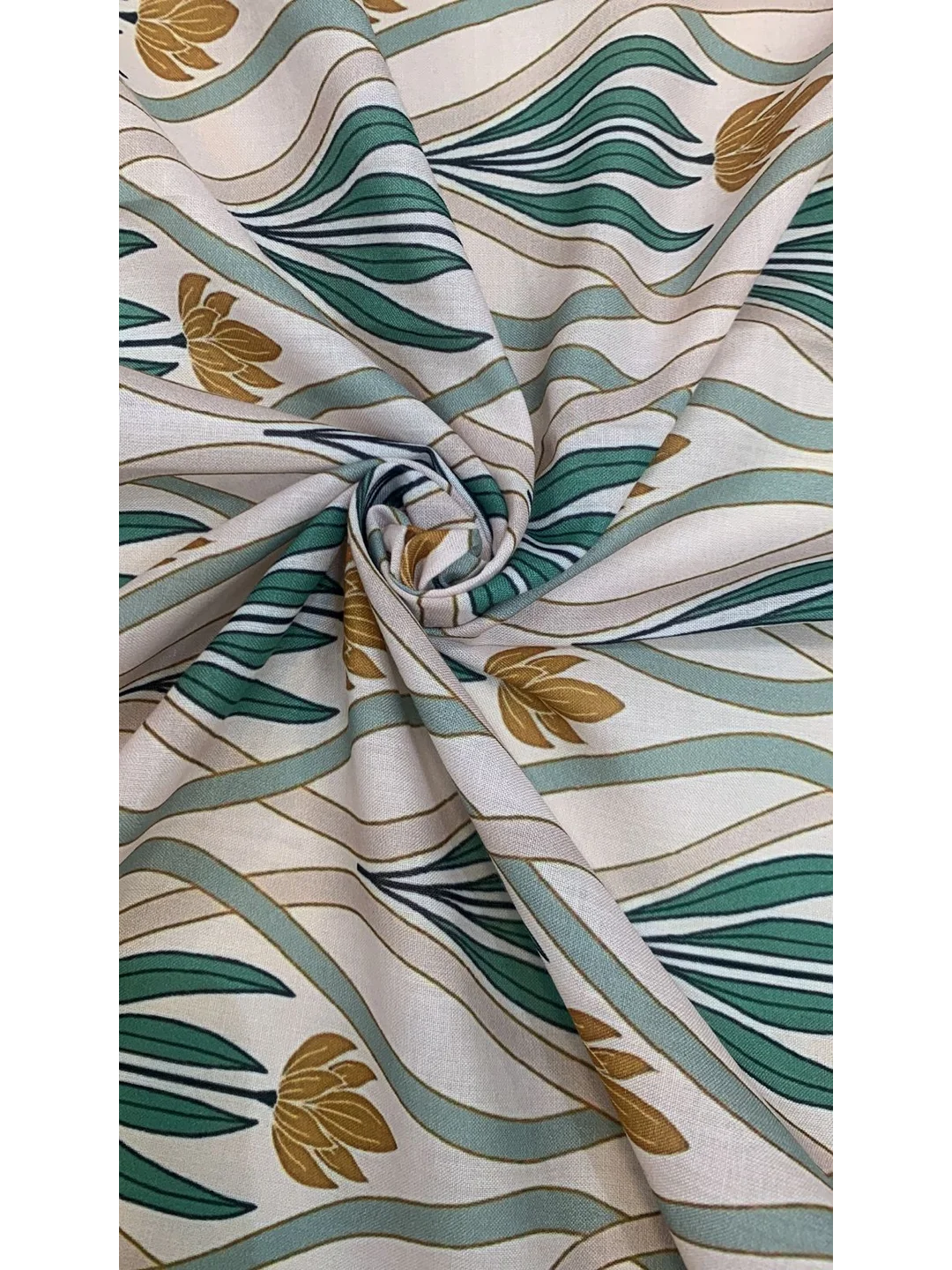 Elevate your summer wardrobe with this premium linen print fabric, crafted to offer a perfect balance of style, comfort, and breathability. The fabric features an elegant abstract floral & leaf motif with flowing lines that add a modern yet natural charm. Set on a soft off-white / beige base, the design is highlighted with teal green, sage green, and mustard accents, giving it a refined and versatile look. Lightweight with a natural linen texture, this fabric drapes beautifully and keeps you cool throughout the day.