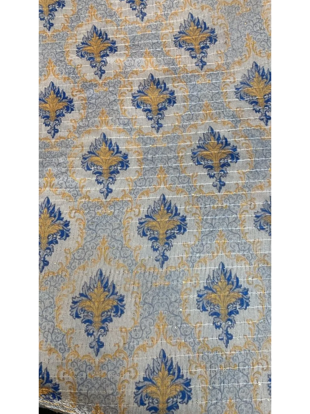 Enhance your ethnic and casual collection with this Pure Cotton Print Fabric, crafted for comfort and elegance. The fabric features a traditional floral motif arranged in a graceful repeat pattern, giving it a rich and timeless appeal. Fine gold-toned detailing adds a subtle festive touch without overpowering the design. The fabric comes in a soft grey base, beautifully highlighted with royal blue and muted gold prints. Lightweight, breathable, and soft on the skin, it drapes effortlessly and is ideal for all-day wear.