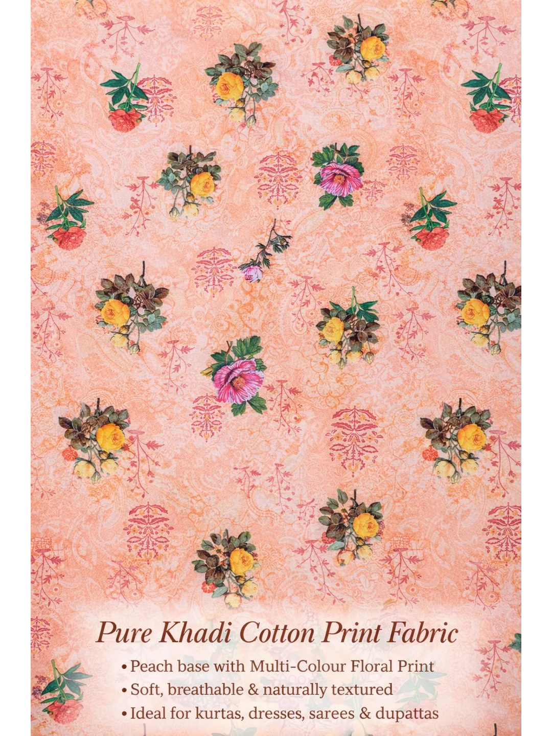 Celebrate handcrafted elegance with this Pure Khadi Cotton Print Fabric, made from authentic handspun cotton that offers natural texture and superior breathability. The fabric showcases a beautiful floral print with vintage-inspired detailing, giving it a rich yet graceful appeal. Set on a soft peach base, the design features multi-colour floral motifs in shades of pink, yellow, green, and subtle earthy tones, creating a warm and refreshing look. Lightweight and airy, this khadi cotton fabric drapes effortlessly and is ideal for comfortable all-day wear.